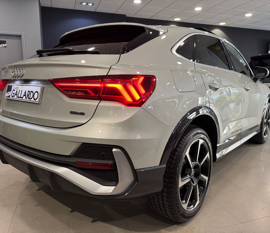 preciosa entrada Audi Q3 Sportback 190cv Stronic Quattro Sline. unidad con una configuración de color Plata Roció y equipamiento extras poco visto. esta unidad se entrega con 1 año de garantía oficial en la marca y una revisión de entrega en Audi. EQUIPAMIENTO DESTACADO: *Tracción total Quattro *volante deportivo multifunción con levas y achatado en la parte inferior *Espejos retrovisores regulación y plegables eléctricos * Paquete Sline exterior *Faros MATRIX LED *intermitentes dinámicos *llantas de 19´´ con neumáticos nuevos montados en Mayo *Navegación MMI Plus con pantalla táctil *Audi virtual Copit *Apple Car Play y Android Auto *Clima Bi zona *Sensores de aparcamiento delanteros y traseros *Control de crucero adaptativo con frenada de emergencia *Asistente de mantenimiento y aviso de salida de carril * Asistente de aviso de Angulo muerto *Encendido automático de luces *Paquete de luces ambiente con 30 colores personalizables *Iluminación de bienvenida con logotipo Sline en los estribos de las puertas *Proyección del logotipo de Quattro en el suelo al abrir las puertas *Reconocimiento de señales de trafico *Sistema Pre Sense Front ( sistema de prevención de colisiones) *Portón trasero eléctrico *Techo panorámico eléctrico *Acceso sin llave y arranque por botón * lunas traseras tintadas y mucho mas equipamiento.... • Disponemos de financiación personalizada con cuotas adaptadas a tus necesidades. • Consulta nuestras RESEÑAS 5 ESTRELLAS EN GOOGLE • Máxima calidad de vehículos de ocasión del mercado, con revisiones en la marca y garantía oficial en toda la península. ANUNCIO SUJETO A CAMBIOS POR ERRORES DE PUBLICACION EN DATOS DEL VEHICULO.